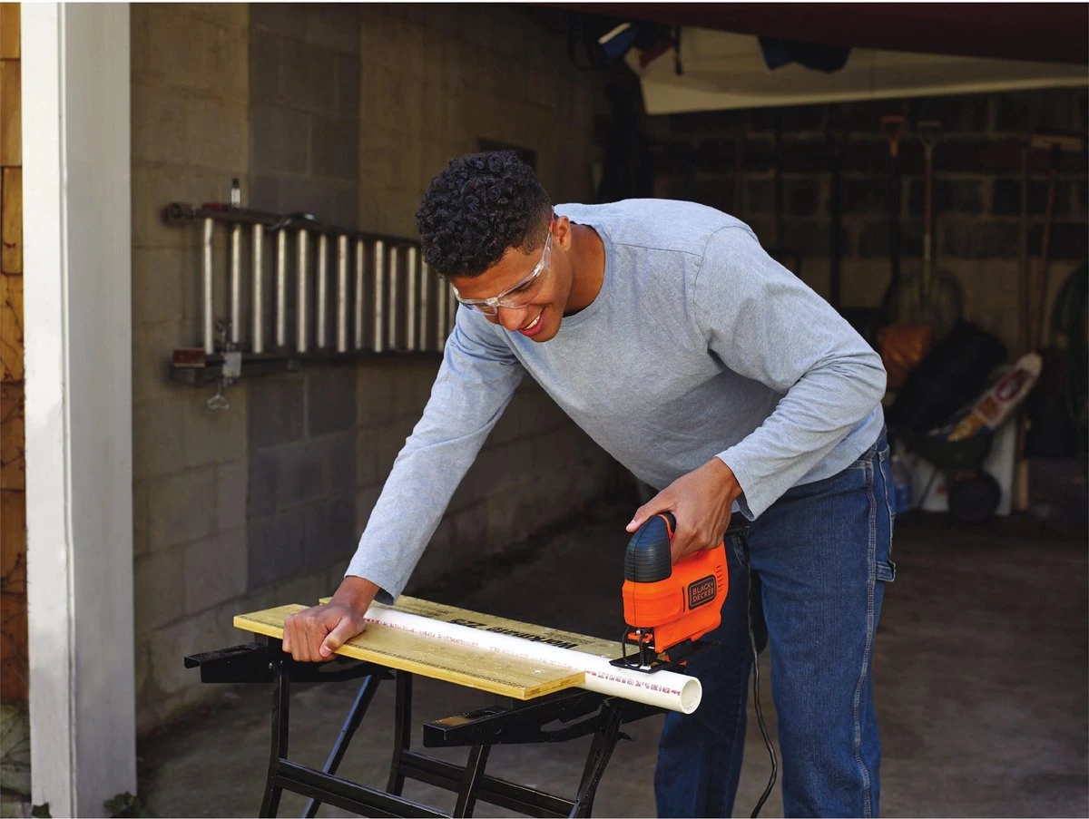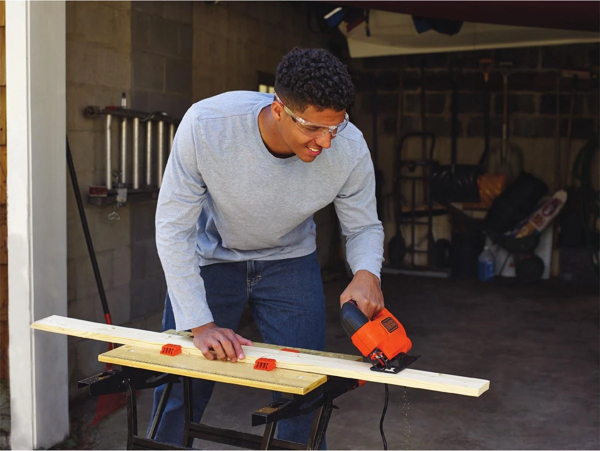 BLACK+DECKER KS701EK-QS compacte decoupeerzaag met variabele snelheid, koffer en zaagblad voor hout. Deze compacte decoupeerzaag KS701EK-QS kan gebruikt worden voor het zagen van lichte doe-het-zelf hobby klussen, het zagen van hout, bochten en 45° afschuinen, het zagen van licht bladmetaal en metalen leidingen etc.