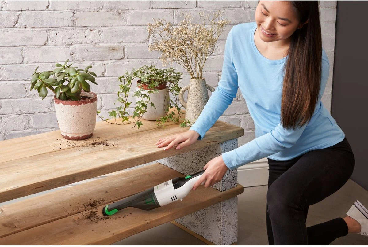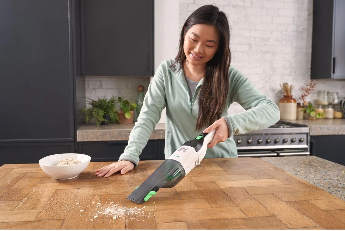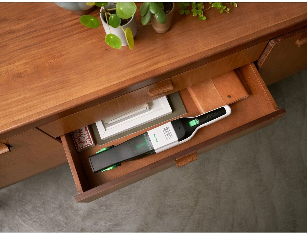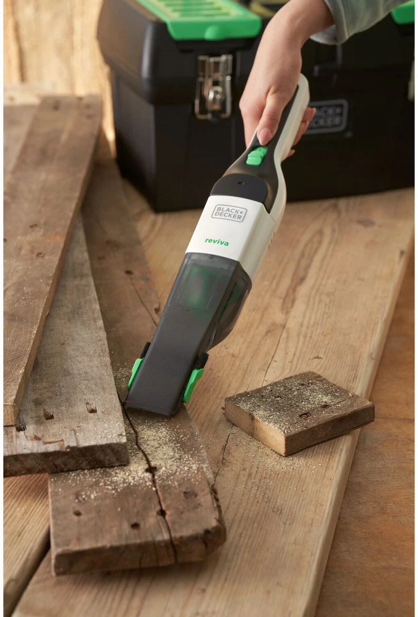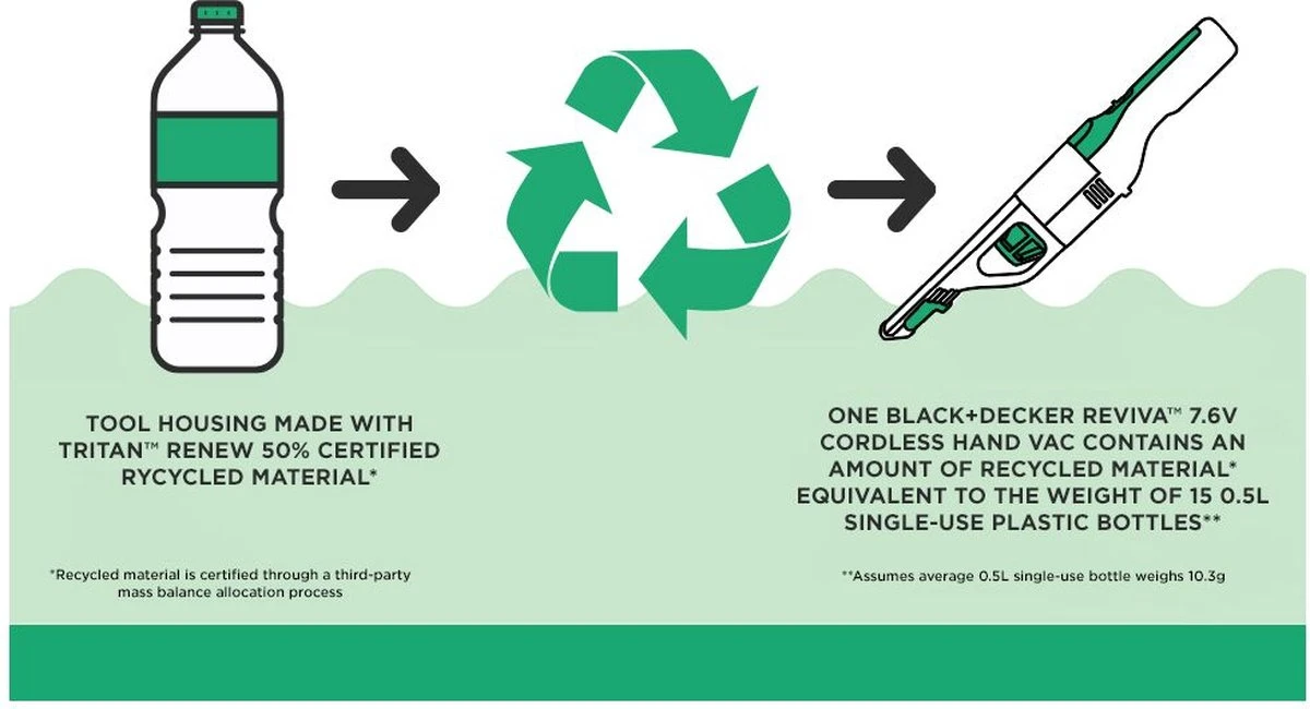 Deze 7.2V BLACK+DECKER Reviva Kruimeldief is een lichte en compacte oplossing voor alle schoonmaakklussen in huis. Zijn slanke design met geïntegreerde zachte borstel levert tot 11 minuten werktijd en de zuigkracht voor een ultieme vuilopname in één beweging. Dankzij het transparante ontwerp weet je steeds wanneer het nodig is het opvangreservoir te legen. Draai het reservoir los, verwijder de wasbare filter en leeg het zonder het vuil aan te raken. Deze kruimeldief maakt deel uit van het BLACK+DECKER Reviva assortiment, waarbij de behuizing gemaakt werd met Tritan™ Renew 50% gecertifieerd gerecycleerd materiaal* en deze behuizing een hoeveelheid gerecycleerd materiaal bevat, gelijk aan het gewicht van 15 0.5L plastic flessen**.